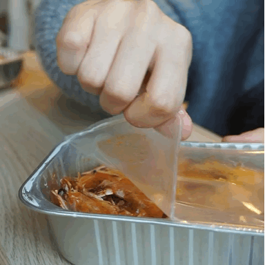 ding~漫長的十分鐘終于過去了,撕開包裝盒,水蒸氣里凝結著醬汁,一股子麻辣鮮香撲面而來。